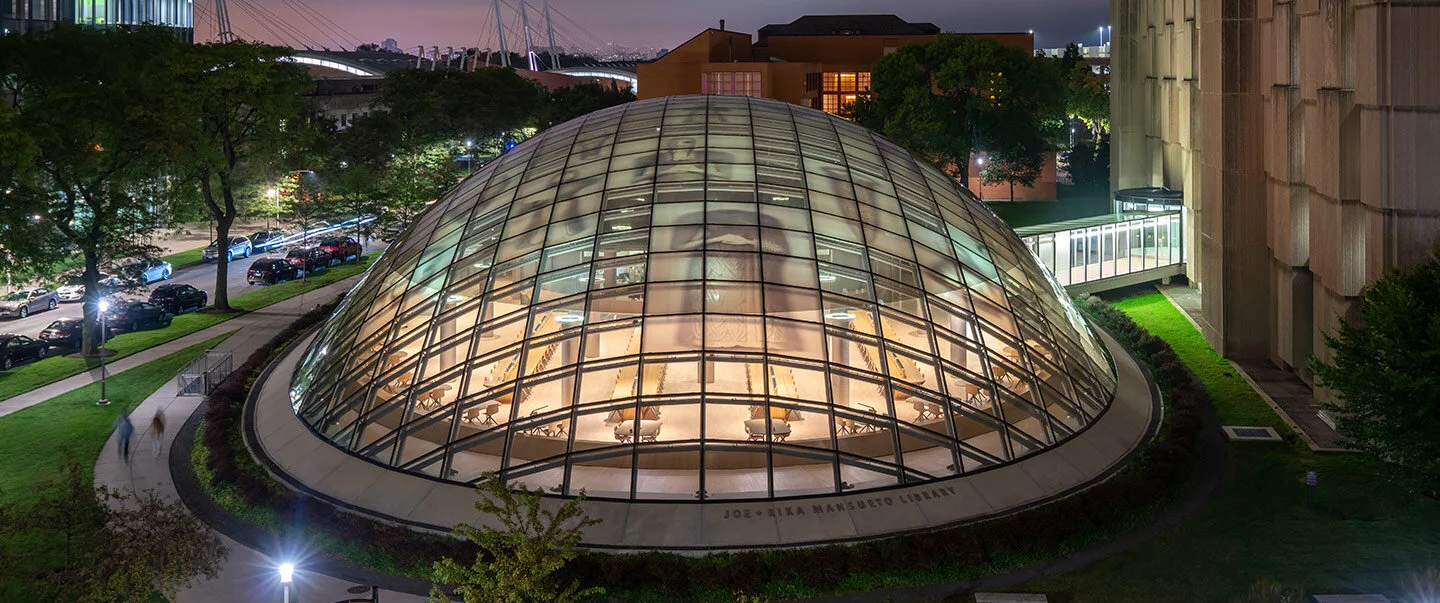 National Medal of Arts and MacArthur “Genius” Fellowship recipient Ann Hamilton created an installation in the popular on-campus study spot, the Joe and Rika Mansueto Library, for her project aeon. The installation features translucent scanned images of Oriental Institute artifacts, previously entombed underground for thousands of years, placed on the library’s glass dome.