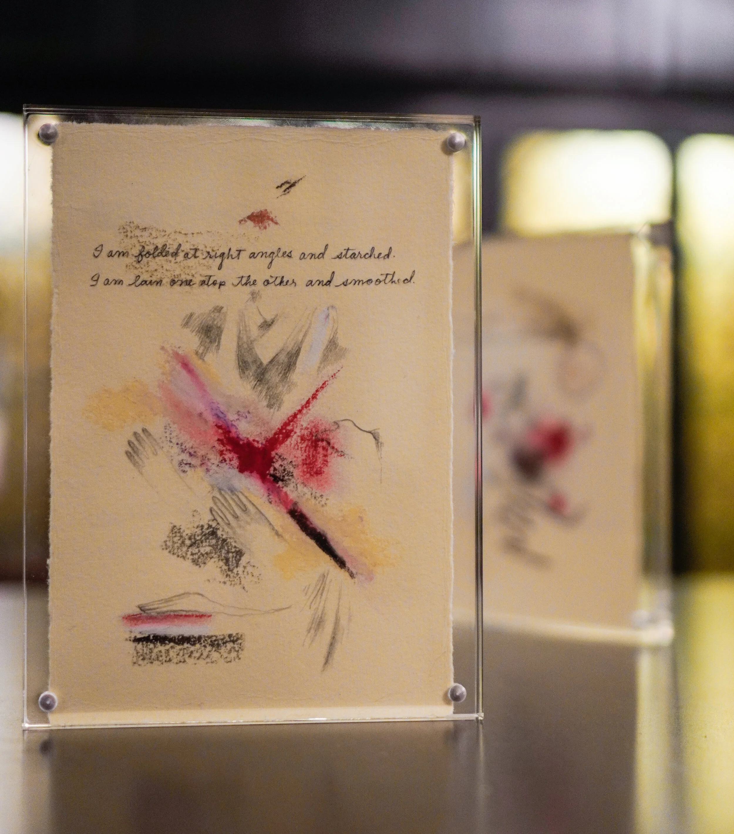 “While taking Dr. Maria Kokkori’s ‘Modern & Contemporary Materialities’ class, I’ve been thinking more about making things that speak to their own construction and components, but also about what it means to destroy ‘artwork’ and subject my self portraits to material processes that negate them–tearing them, burning them, drowning them... This piece is a work in progress down that route.”