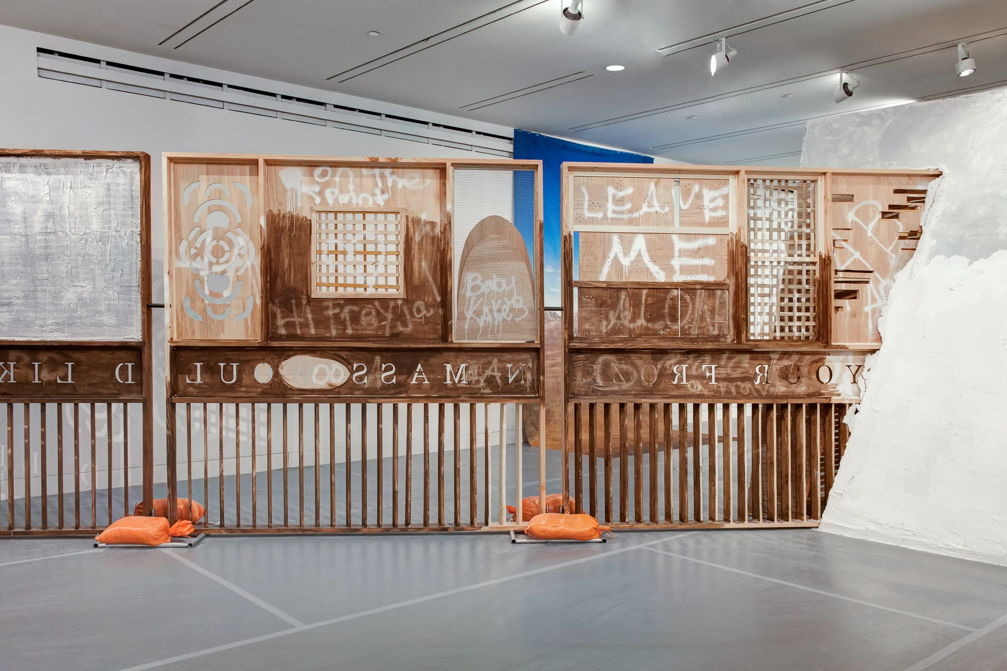 Builder Sami’s antics stood in stark contrast to Builder Tasha’s tour, who employed a more chronological form of storytelling. Returning to the main gallery’s border wall, with its graffitied wooden panels and numerous peep-holes to the other side, Builder Tasha resumed Pangolo’s story, explaining that the wall panels were the same mashrabiya screens that were exhibited in the World’s Columbian Exposition in 1893, lent by the Field Museum.