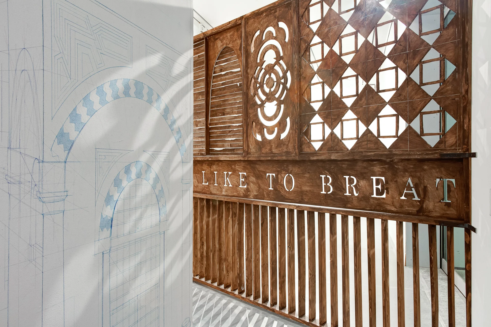 One particularly striking inconsistency was between the mashrabiya screens and Builder Anthony Adcock’s wall-drawing of the Cairo Street exhibit positioned near them. The sharp, architectural sketches, rendered in blue, seem like more faithful depictions of medieval Egyptian architecture. Other parts of Builder Anthony’s drawings melded into murals hung on the gallery walls, imported from a previous iteration of Atlas Unlimited. A fine artist and iron worker, Builder Anthony’s drawings of artificial walls used in film sets successively transform into rectangular segments reminiscent of a border wall, particularly relevant to current American political discussions.