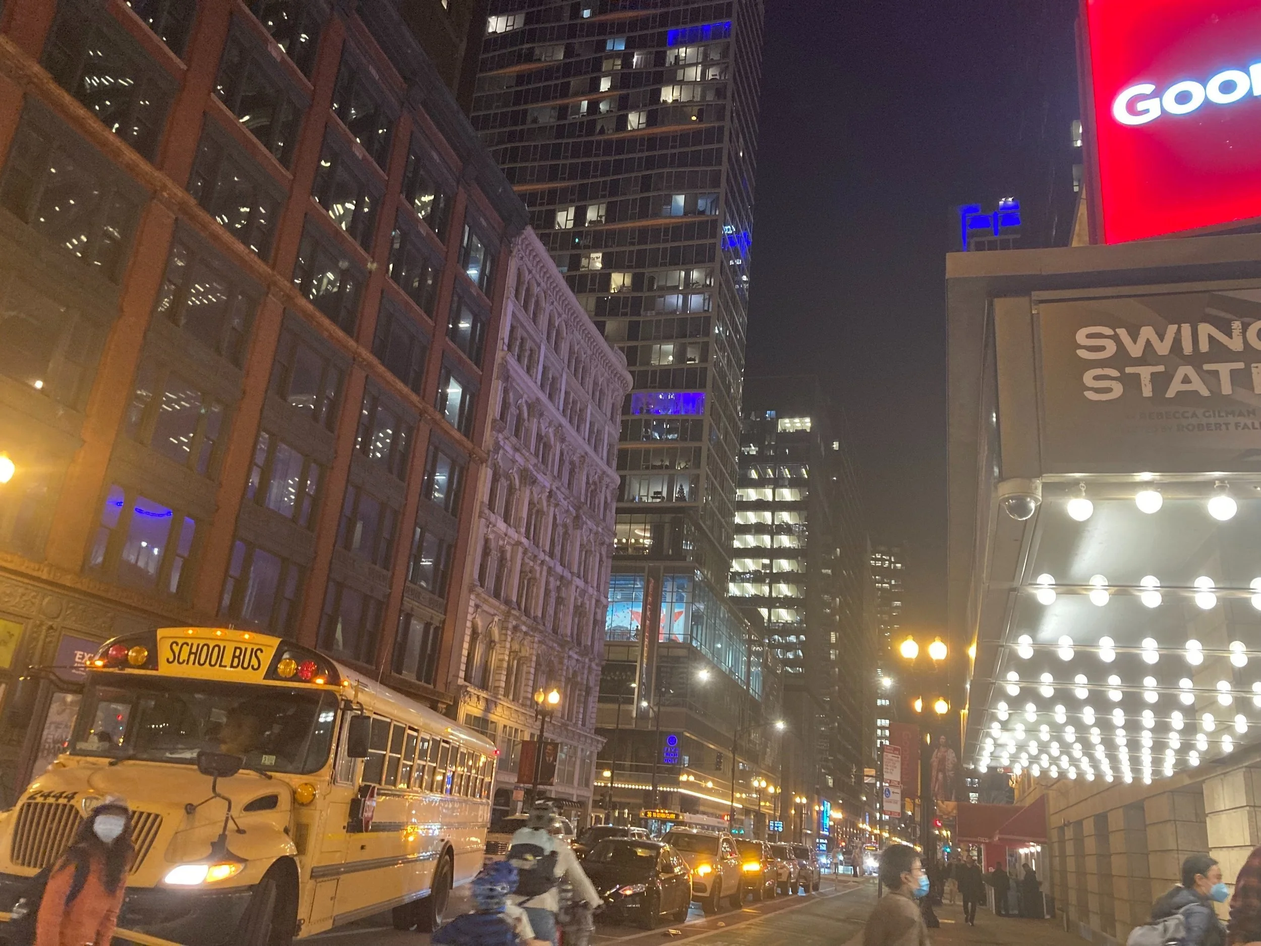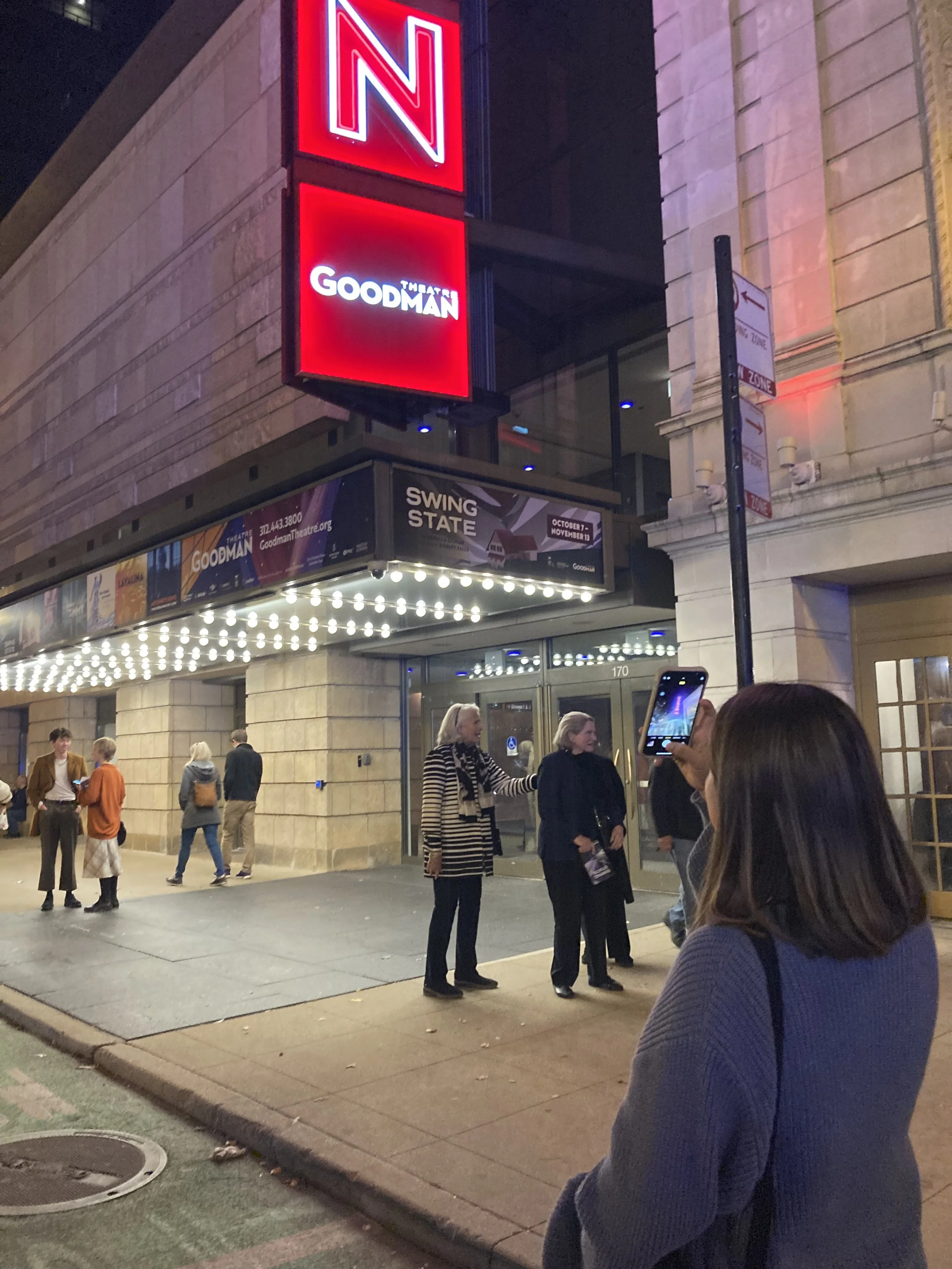 On the way out the door back to the bus, I ask Mitski what she thought of the show. She’s a second-year data science and econ major who’s taking a Theater & Performance Studies course to fulfil her arts core requirement this quarter. Seeing the show fulfilled a class assignment – but she also told me on the bus that she loves seeing plays and used to go with her family quite a bit. Plus, she said, Chicago has so much theater – she should really see more of it while it’s right here and the ArtsPass makes it so accessible. “I loved it – I thought it was great,” she says. She and the rest of the students are chatting animatedly as they board the bus back to Hyde Park. But Mitski stops to take a picture of the Goodman’s iconic marquee.