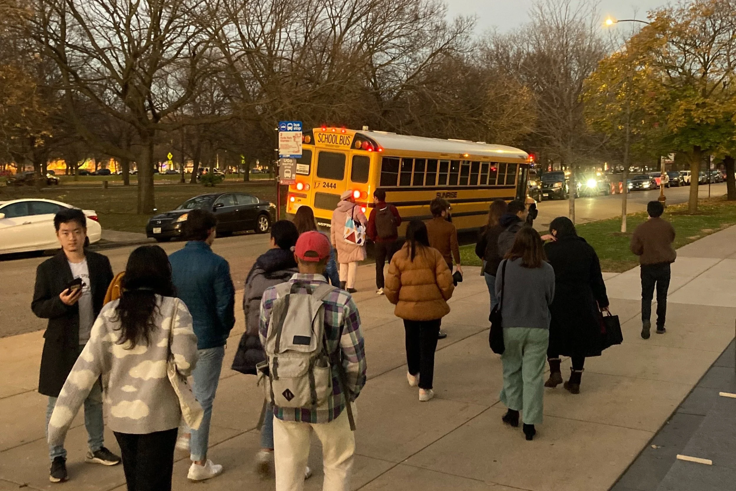 Students board the bus outside the Logan Center for the Arts on their way downtown.